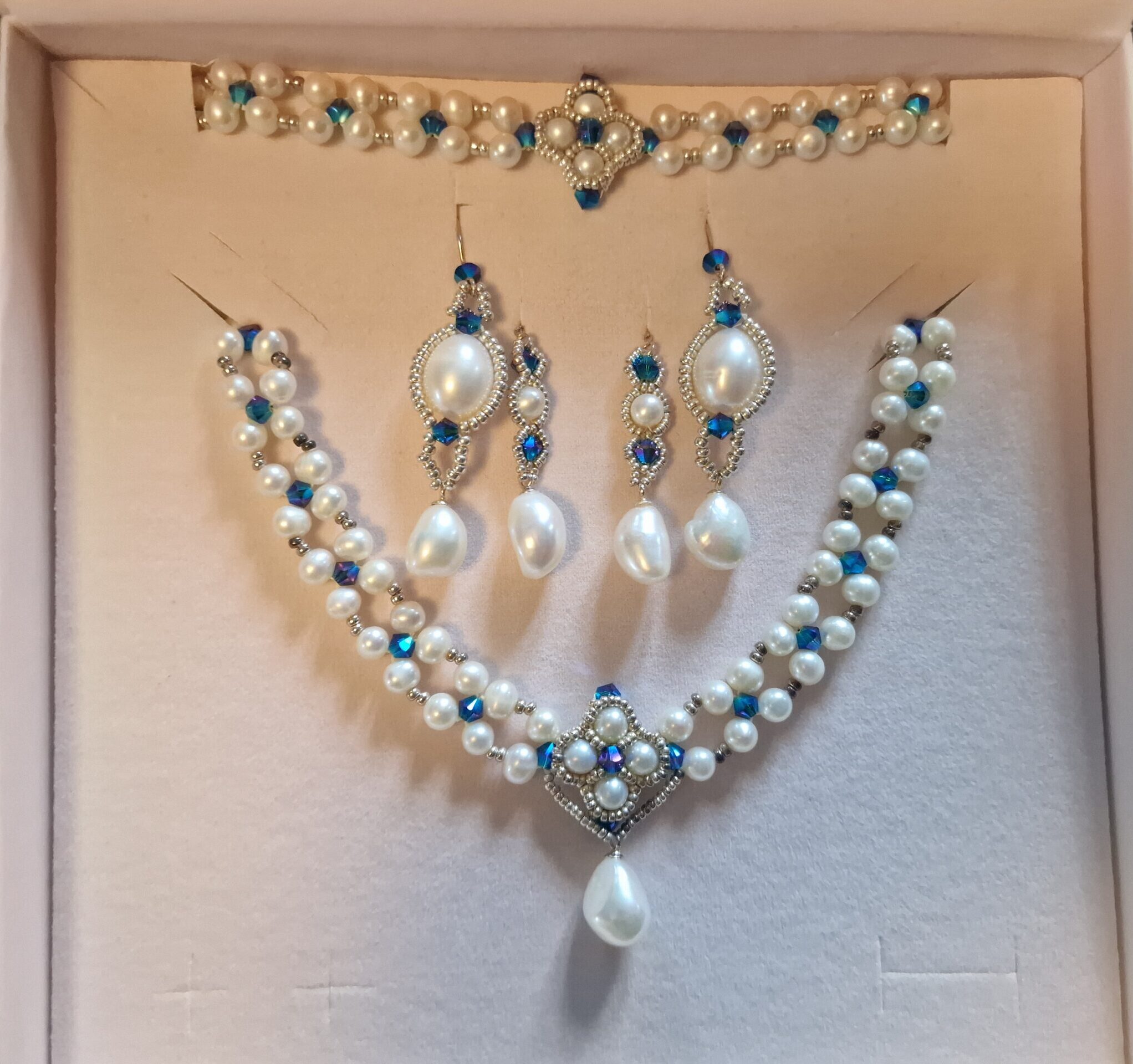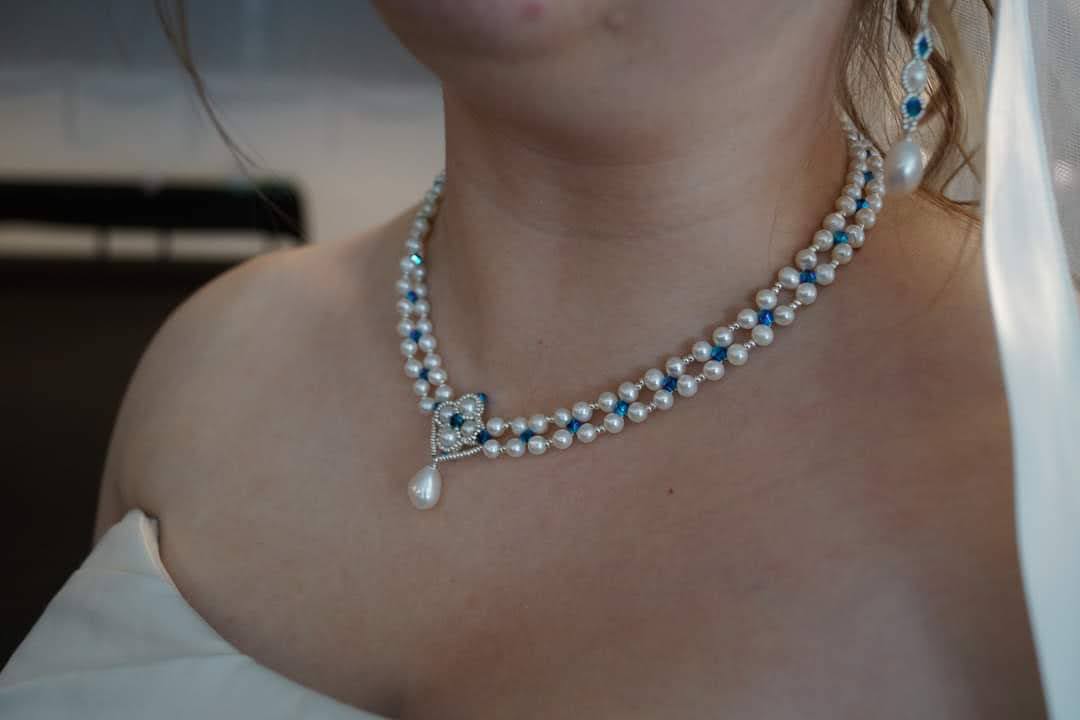 Our wedding sets can be fully customised accoring to the brides wishes. Here we have a baroque inpired wedding set, complete with necklace, wristlace and 2 pairs of earrings. Perfect for both the church and the party after.