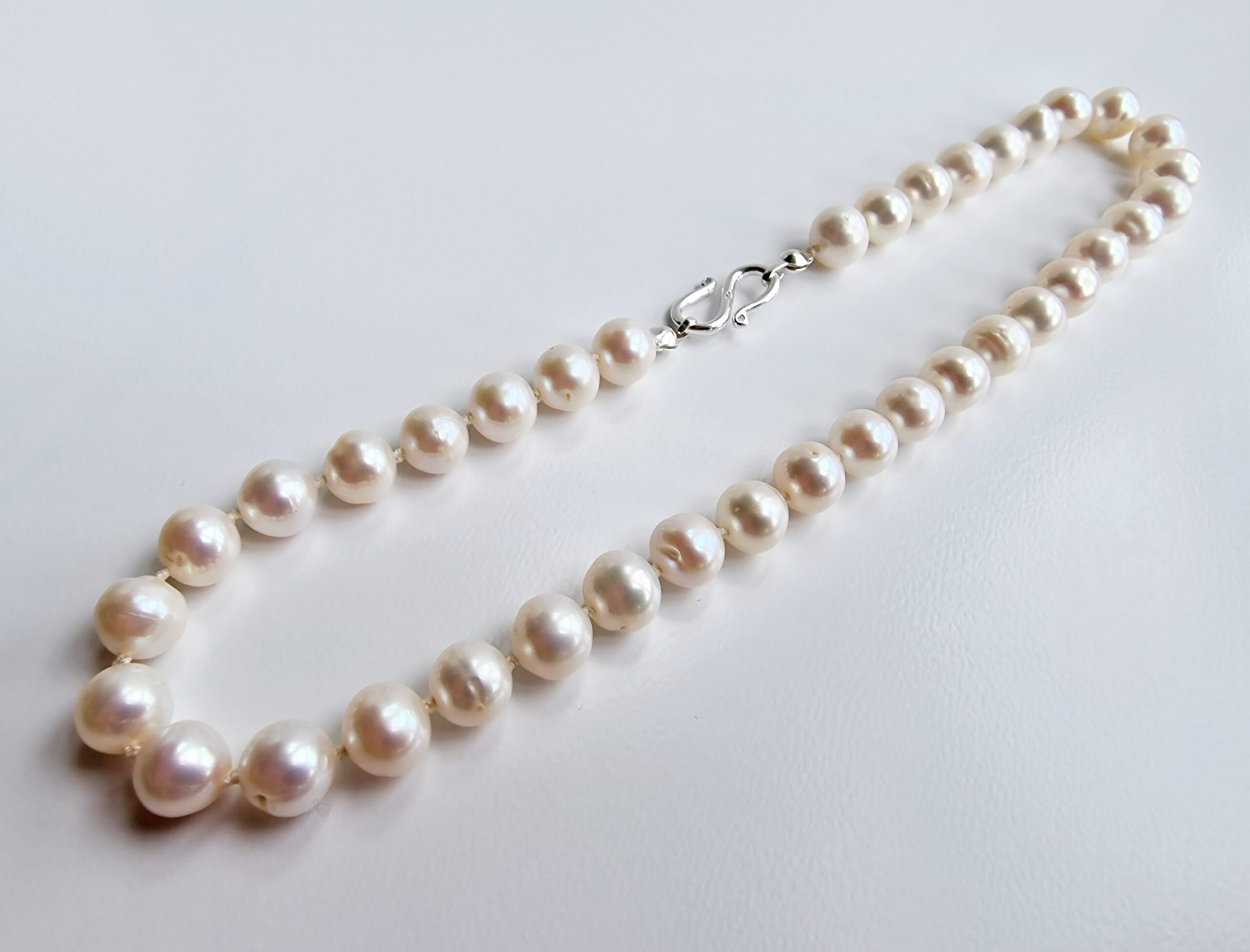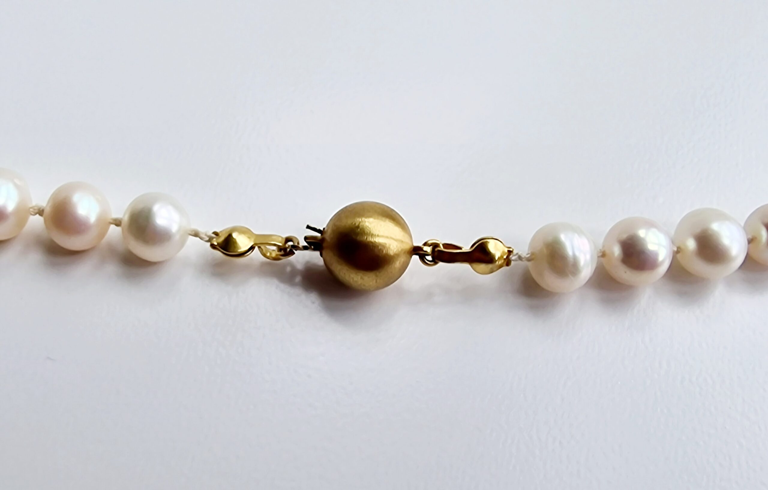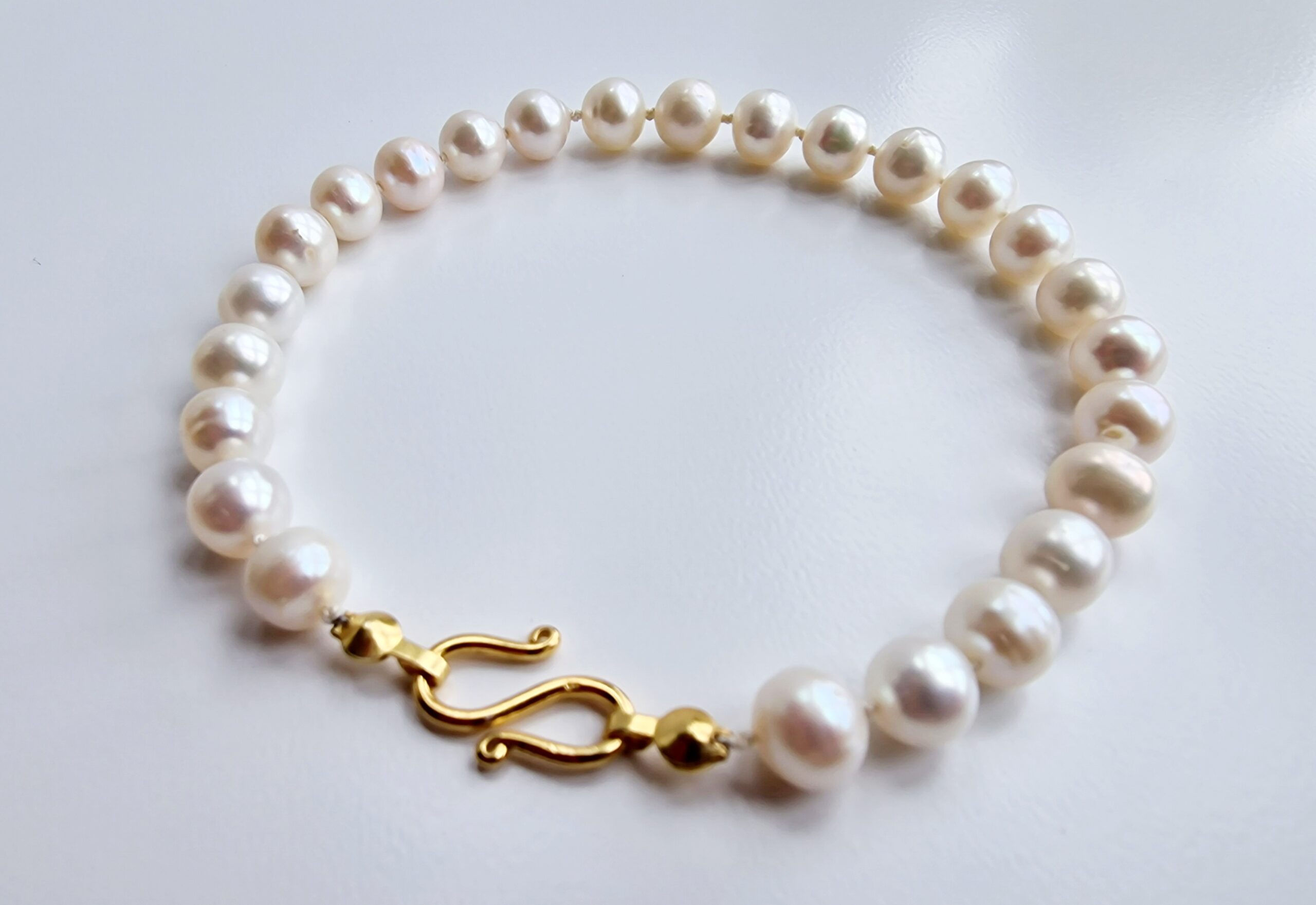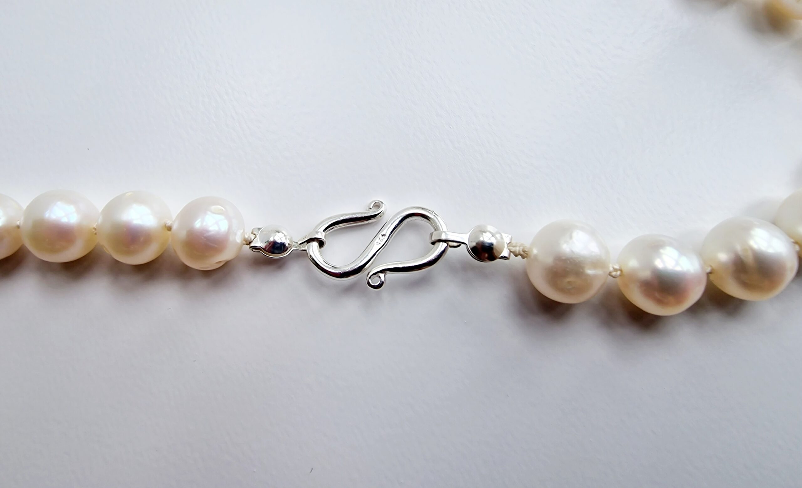 Our Róskva pearl bracelet are created carefully, by knotting each pearl individually on a single piece of silk thread. The pearls are secured by this method in case the bracelet breaks so that your investment is not lost and rolling all over the floor. This also keeps the pearls luster as they are not rubbing up against each other, wearing down their nacre. The strands are fitted with one of two types of clasps.